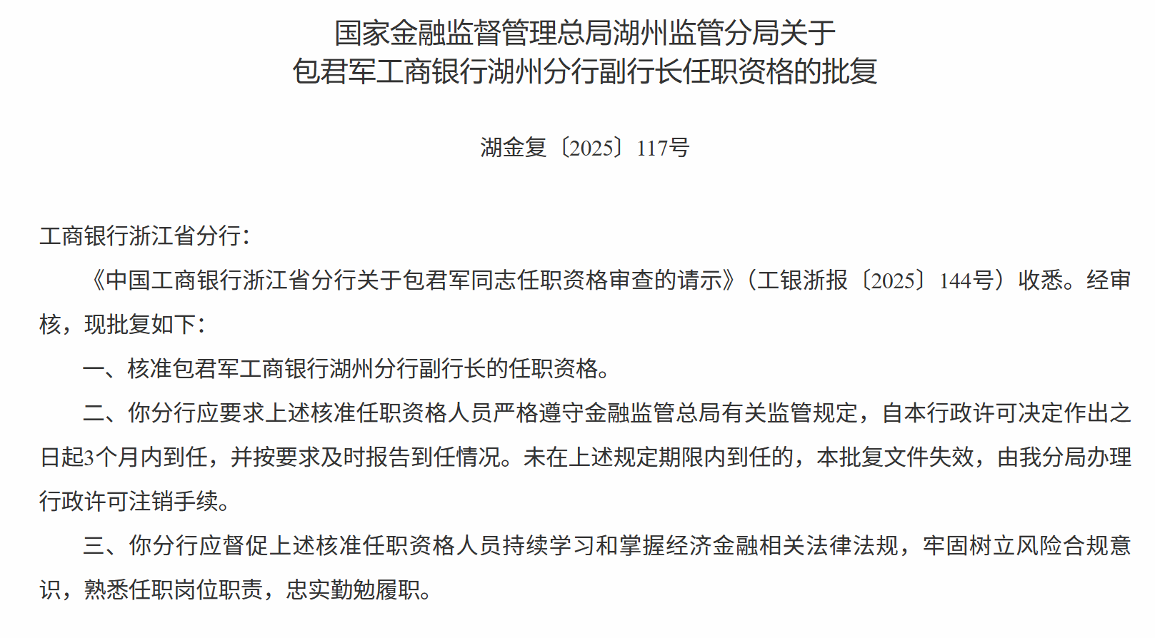 11月17日,国家金融监督管理总局湖州监管分局发布关于包君军工商银行湖州分行副行长任职资格的批复,核准包君军工商银行湖州分行副行长的任职资格。